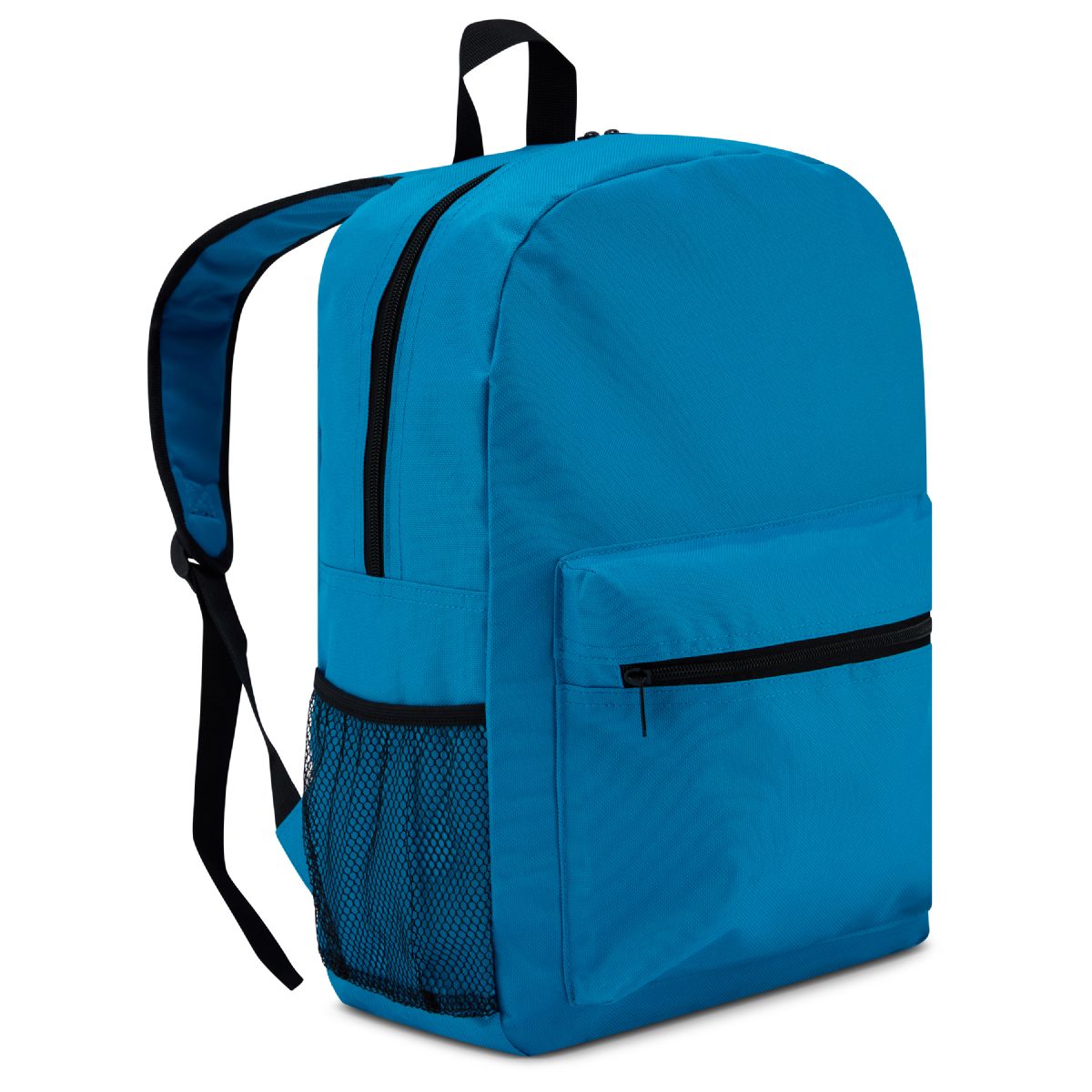 Perfect 17 inch backpack for kid's or anyone who just need a basic bag to take to and from school or camp. Side mesh pocket is good for water bottles. Adjustable padded Shoulder straps accommodate a wide range of ages. Features a handle on top for easy carrying. Water resistant lining and double zipper makes this easy to open & close plus its safe from light water. Many great colors to choose from.